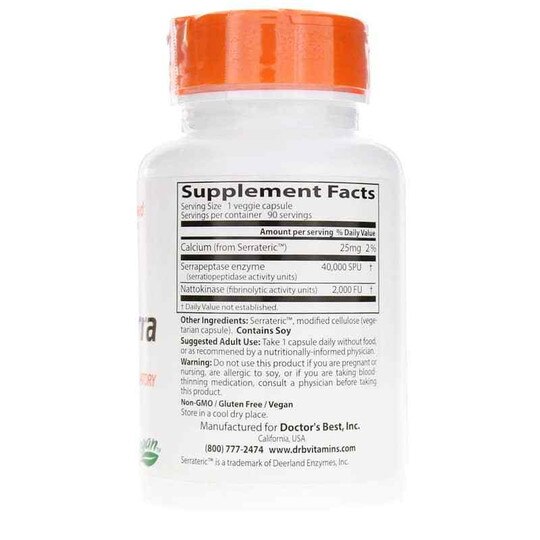 Doctor's Best Serrapeptase - 270 Veggie Caps - eVitamins.com Doctor's Best Serrapeptase is an enzyme with some calcium. Warnings: Keep out of reach of children. Notes: Vegan. Non-GMO. Gluten free. Recommended Use: Take 1 capsule up to 3 times daily without food, or as recommended by a nutritionally-informed physician. Disclaimer: Actual product packaging and materials may contain more and different ...